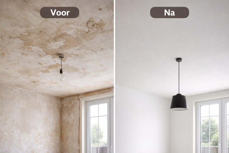 Hier ziet u het verschil tussen vóór en na het stucwerk.